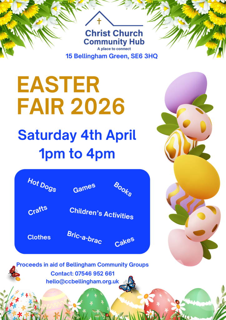 Easter Fair Saturday 4th April 2026 Browse the books, check out the bric-a-brac, and meet new friends over tea and cake or some tasty food. A good way to spend Saturday afternoon of the Easter weekend at Christ Church on Bellingham Green.