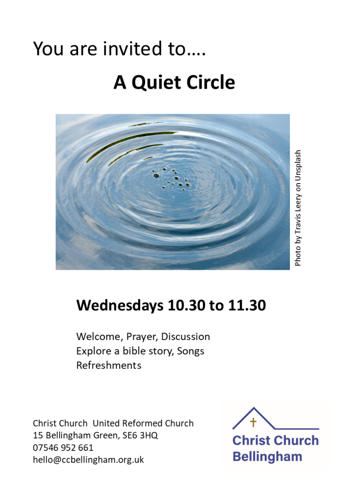 Come along on Wednesdays to A Quiet Circle, for discussion, bible story and prayer over tea, coffee and biscuits. 10.30 to 11.30.